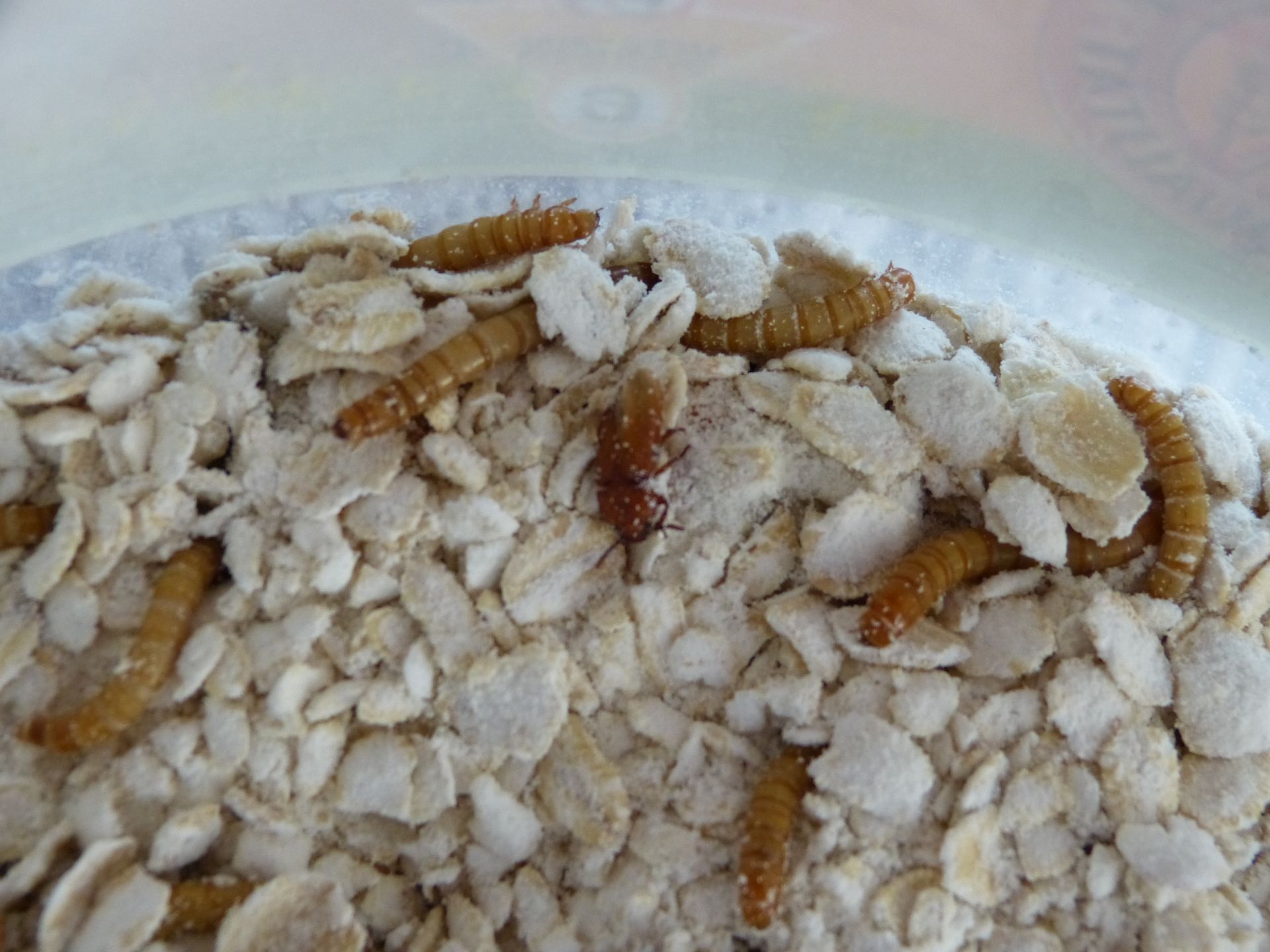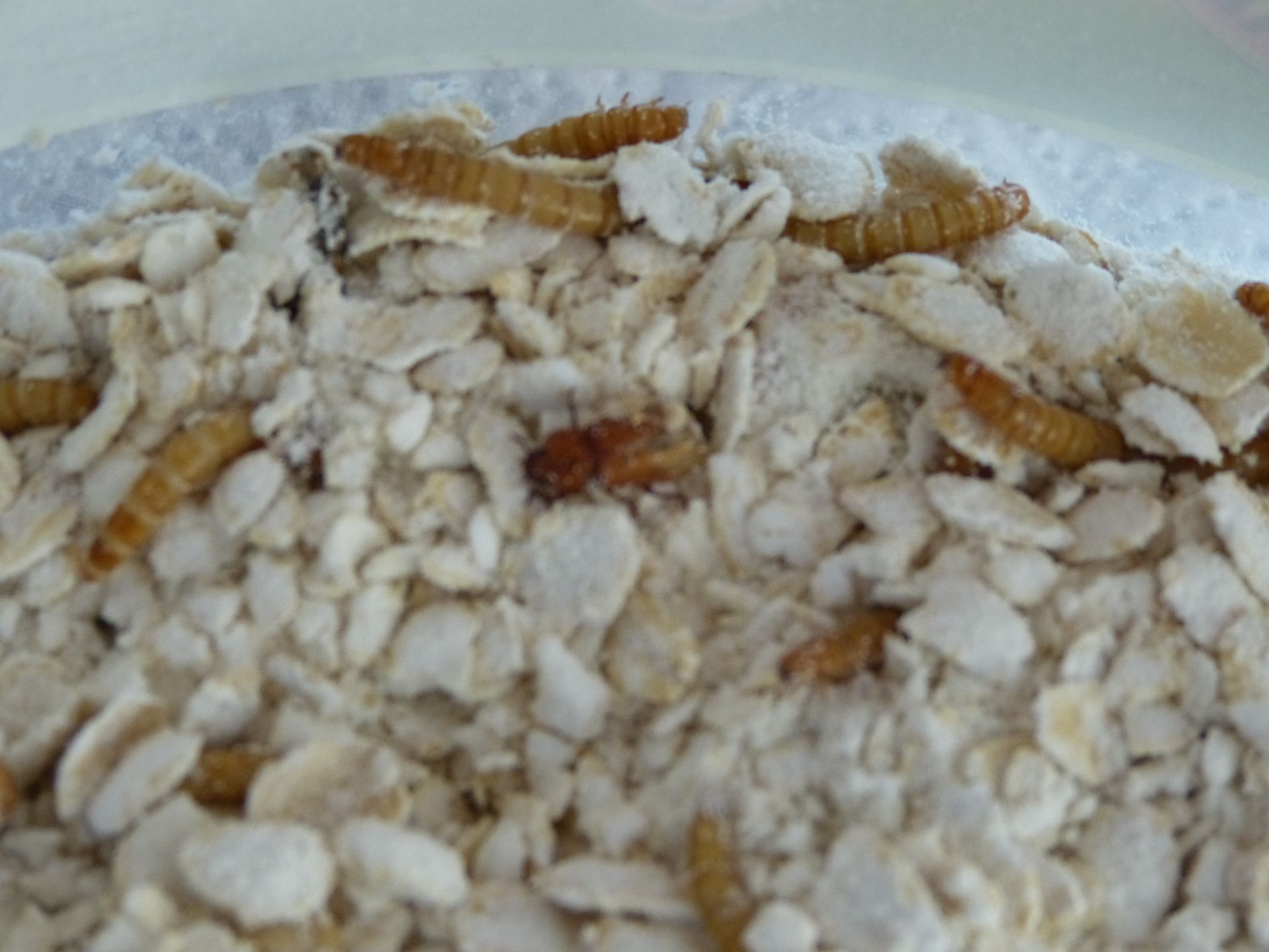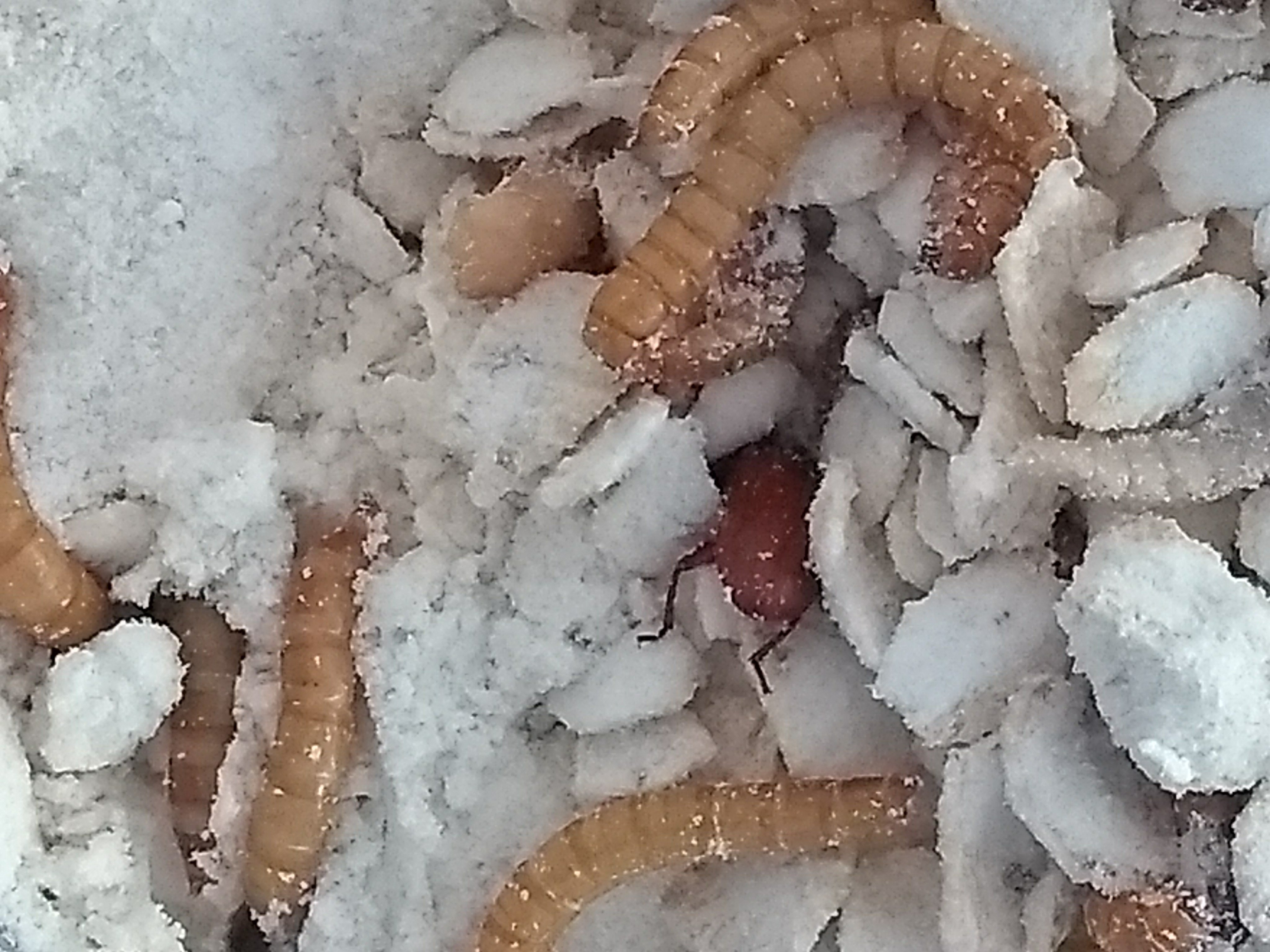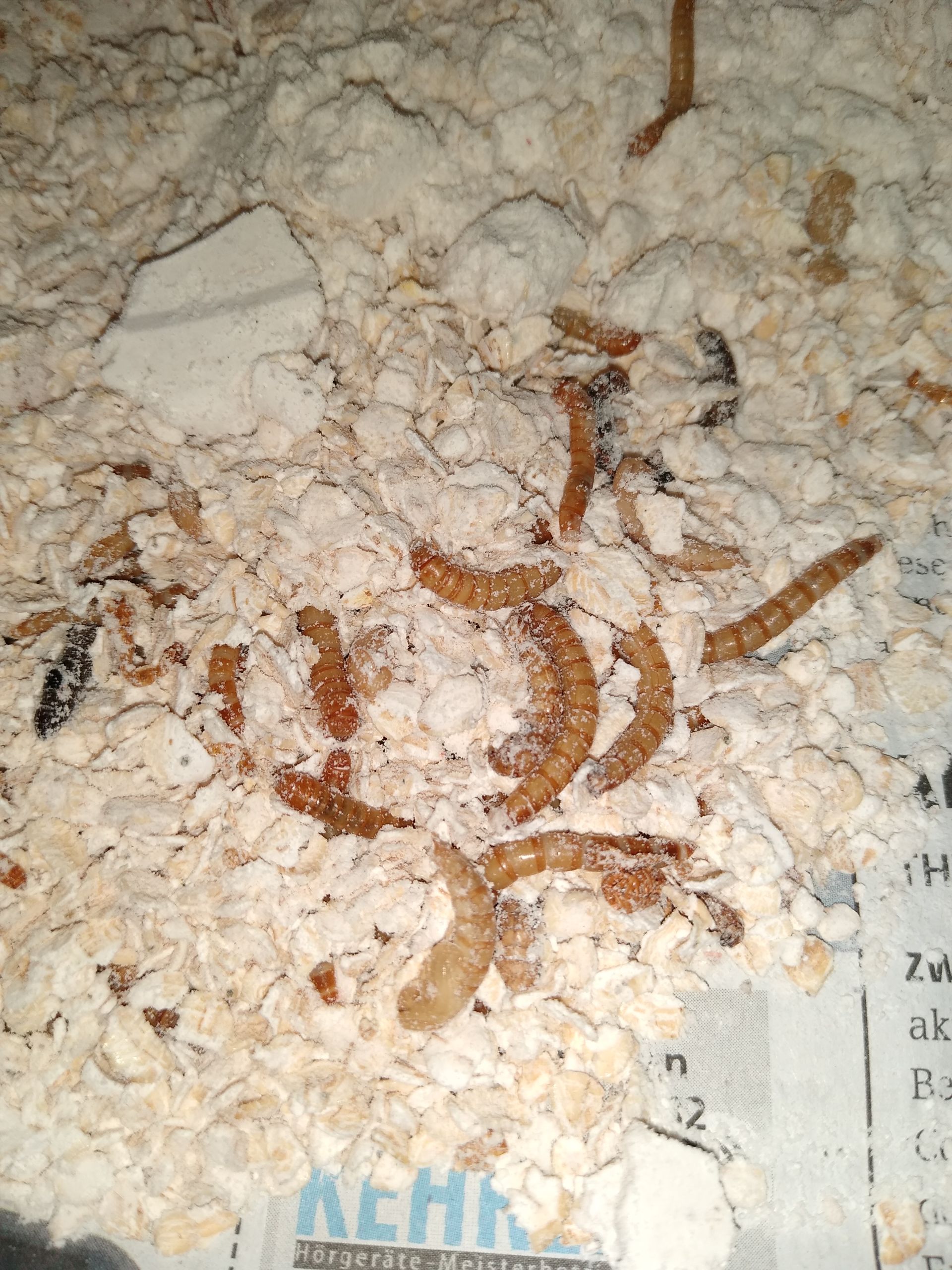 Den Tieren geht es gut. Sie vergraben sich im Mehl/Haferflocken-Gemisch und scheinen sich sehr wohl zu fühlen.