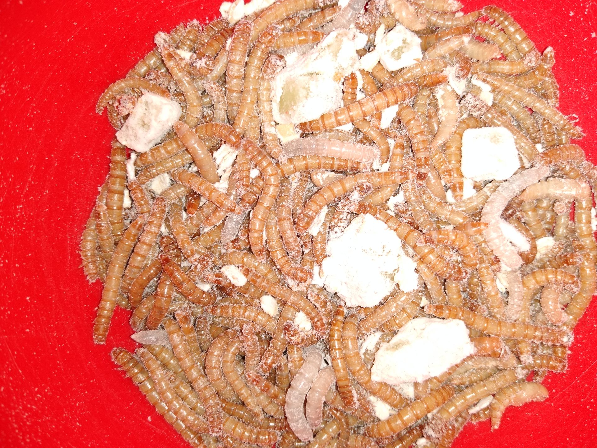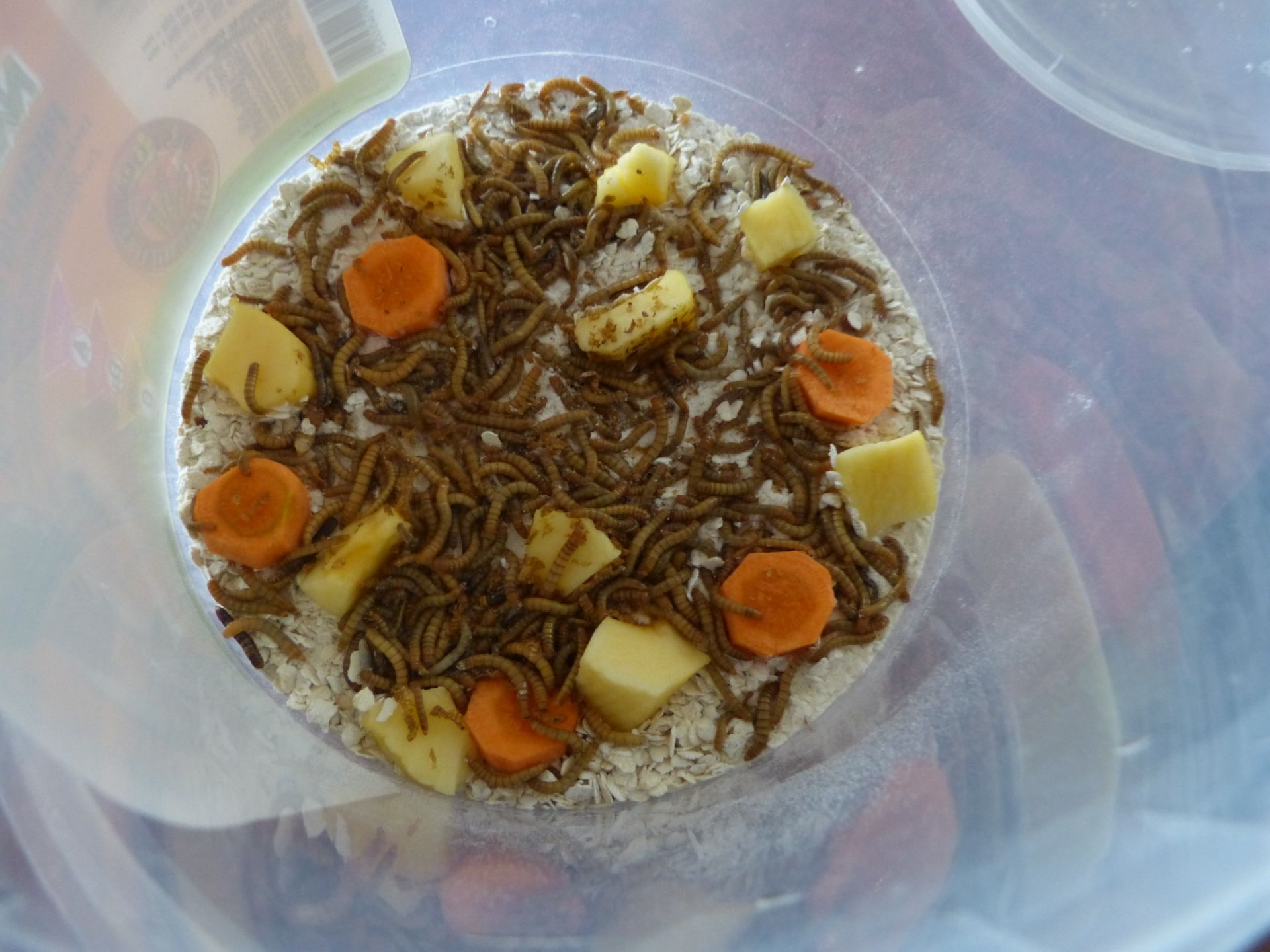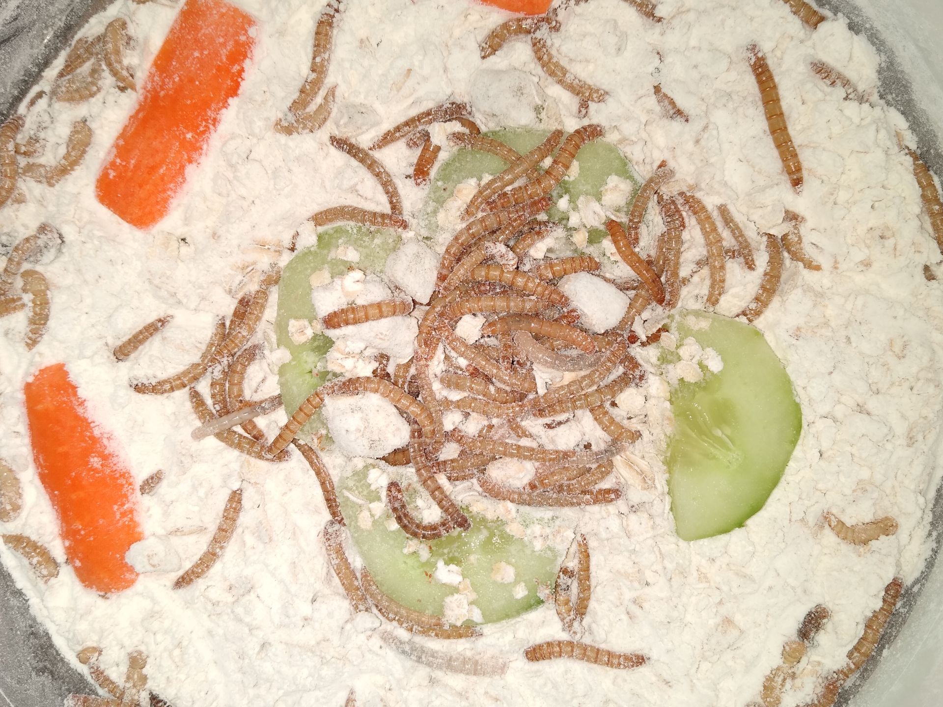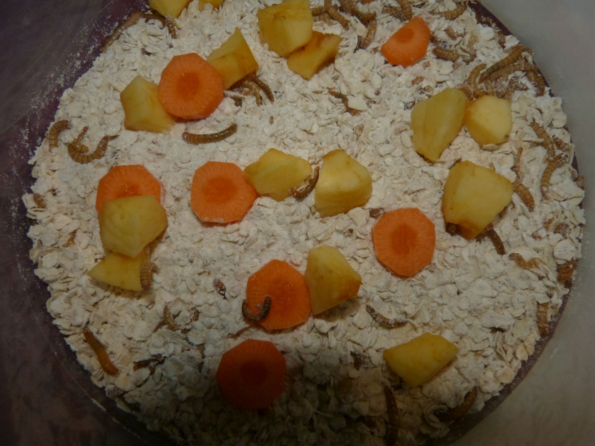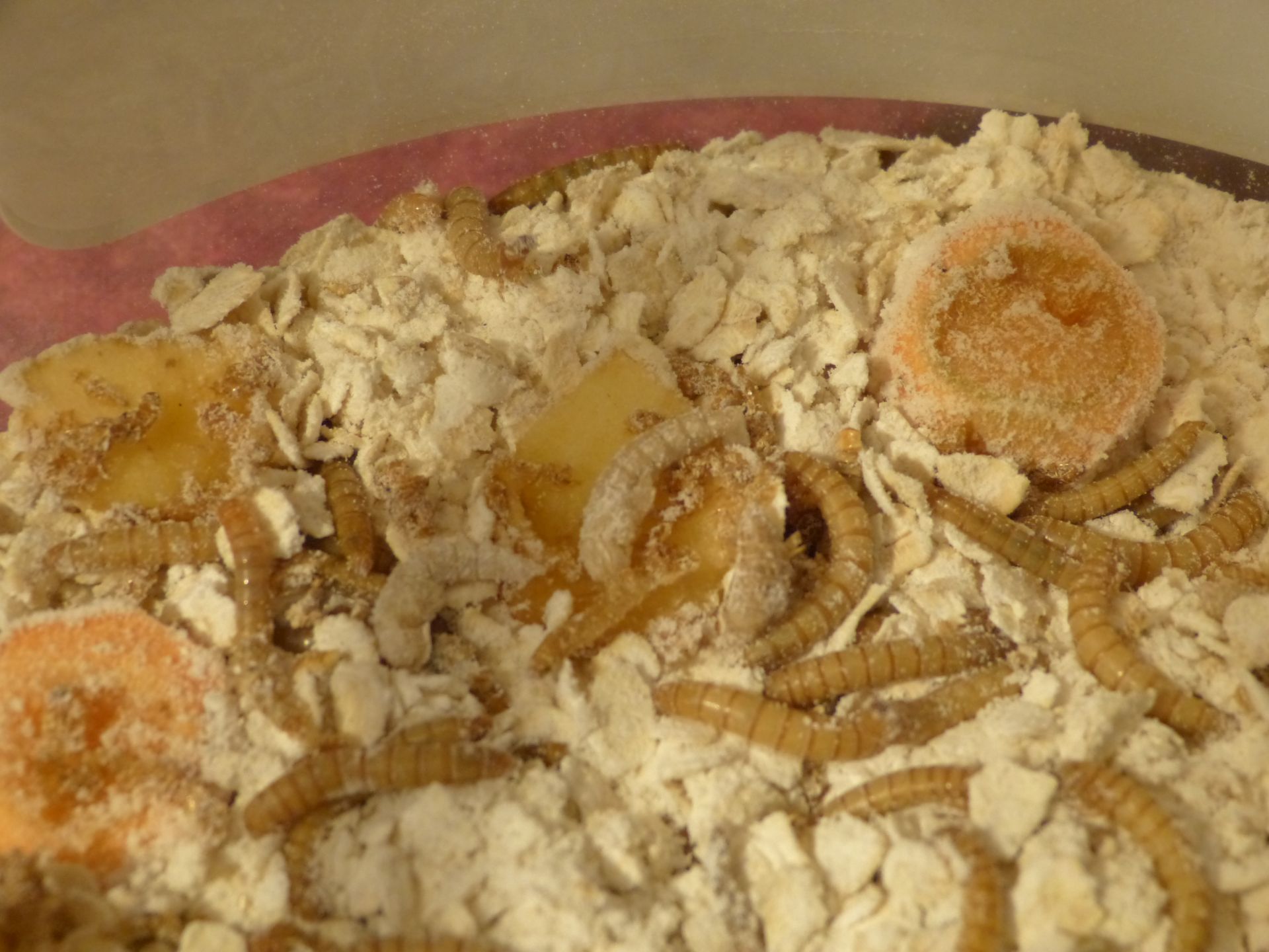 Den Tieren geht es gut. Sie vergraben sich im Mehl/Haferflocken-Gemisch und scheinen sich sehr wohl zu fühlen.
