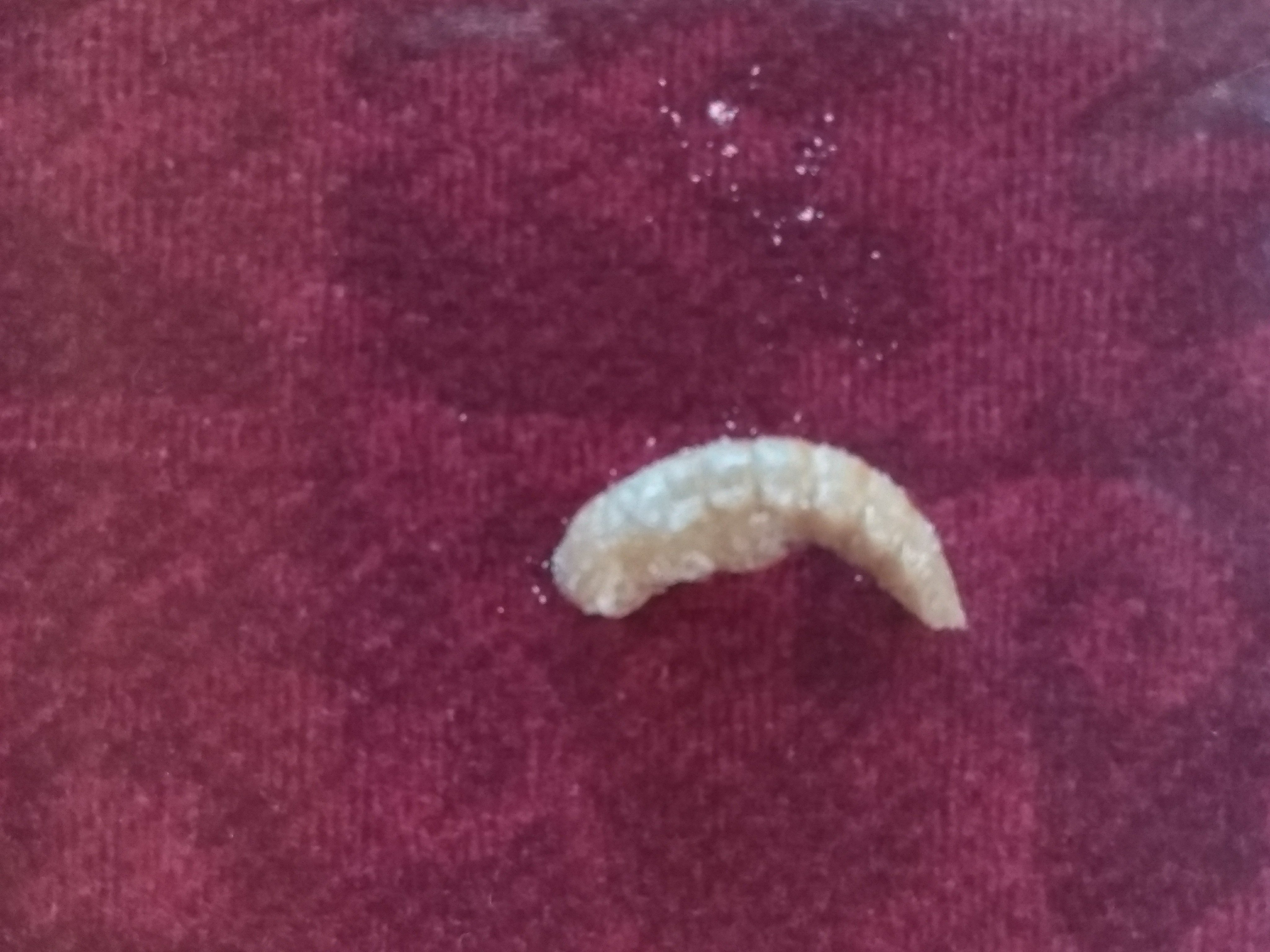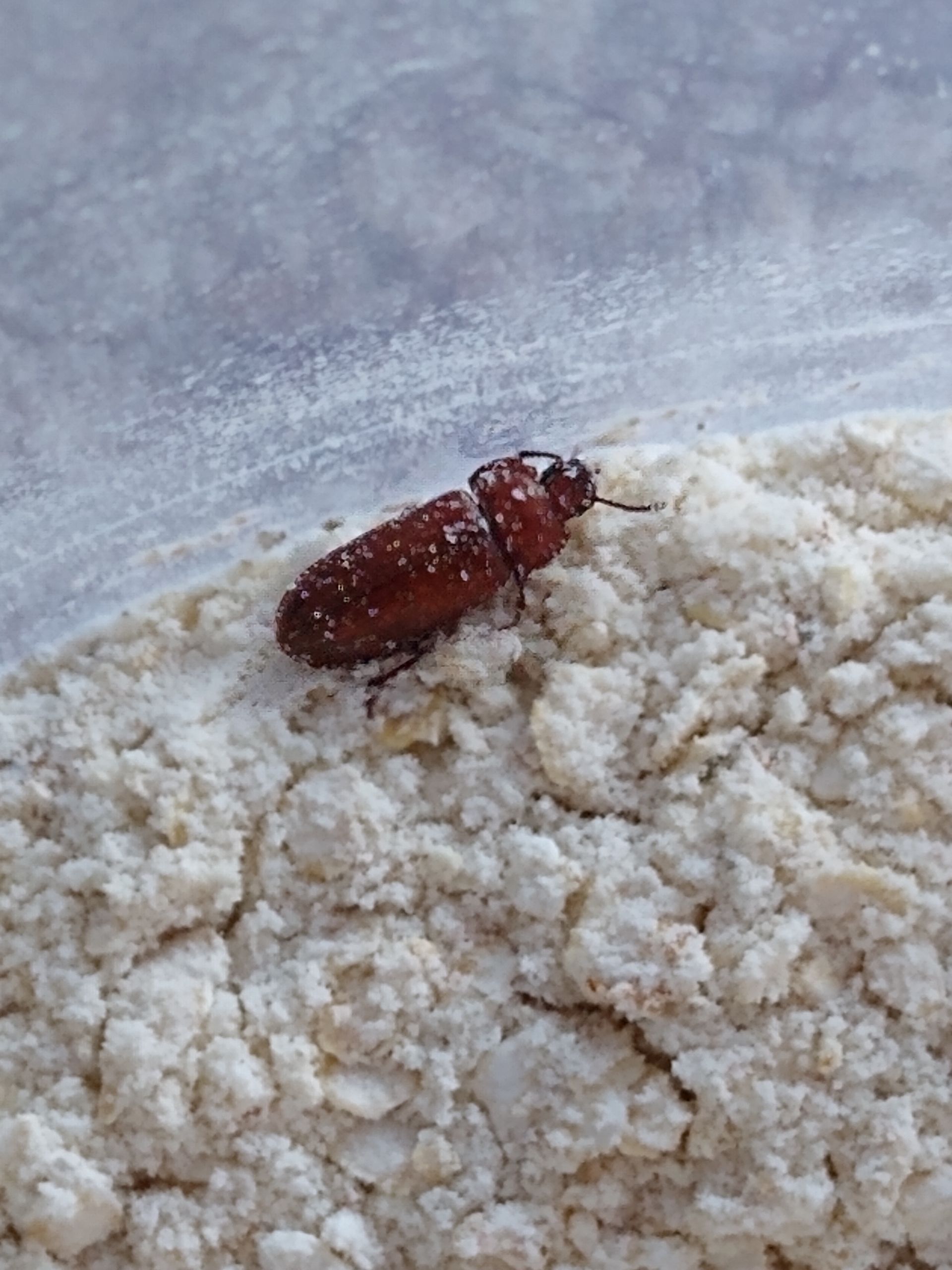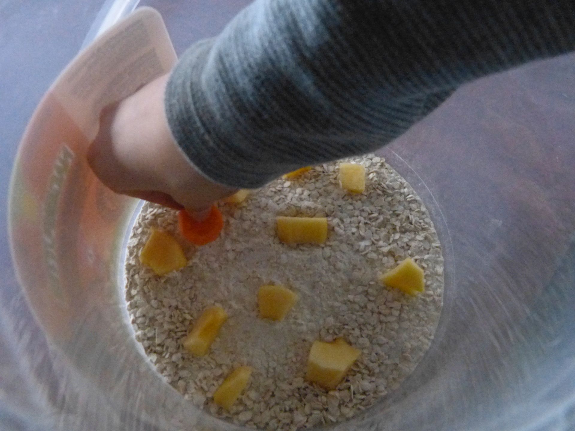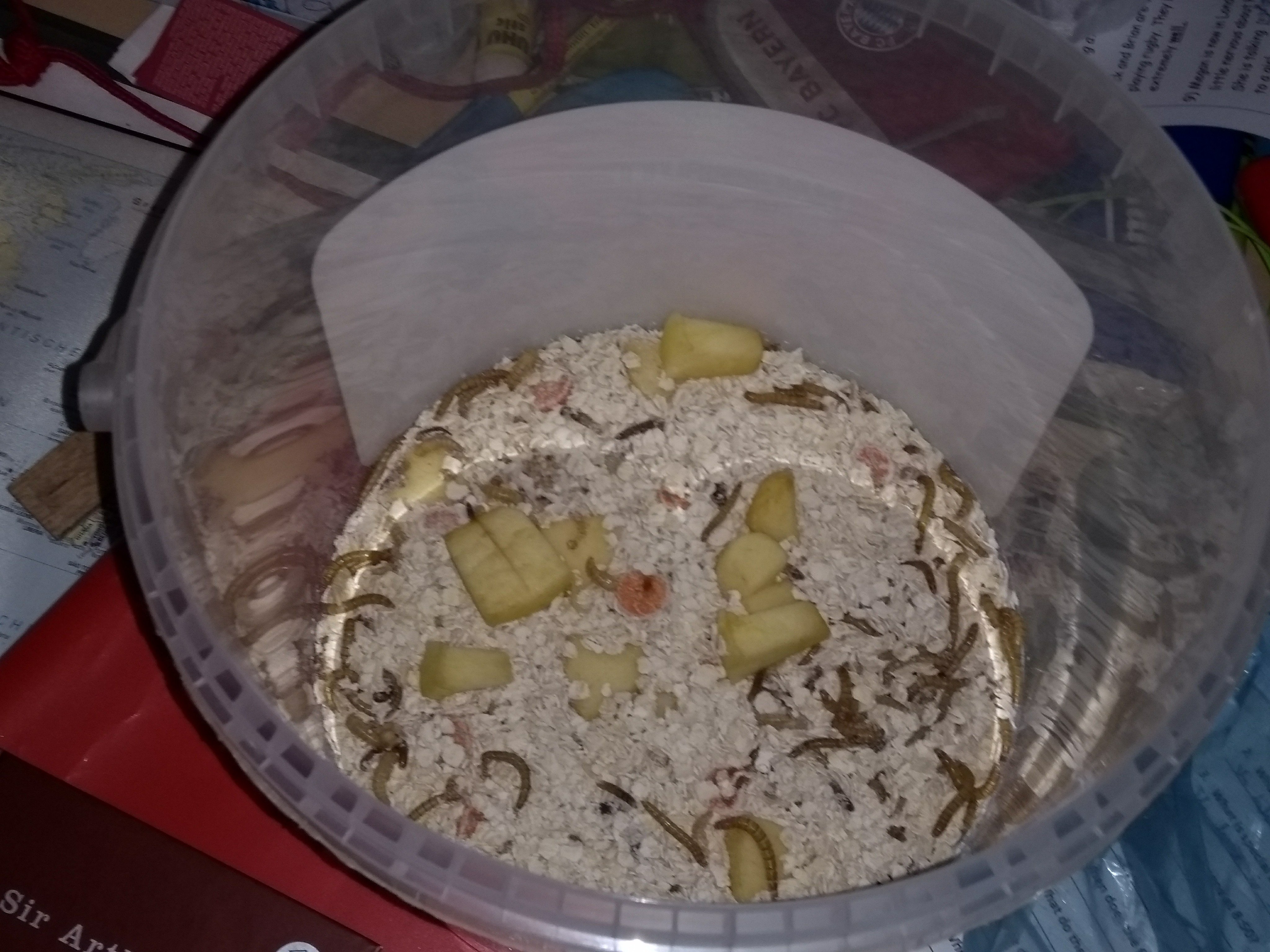 Heute habe ich Futterreste entfernt und neues Futter in den Behälter gegeben. Dabei musste ich auch etwas im Mehl-/Haferflockengemisch wühlen.