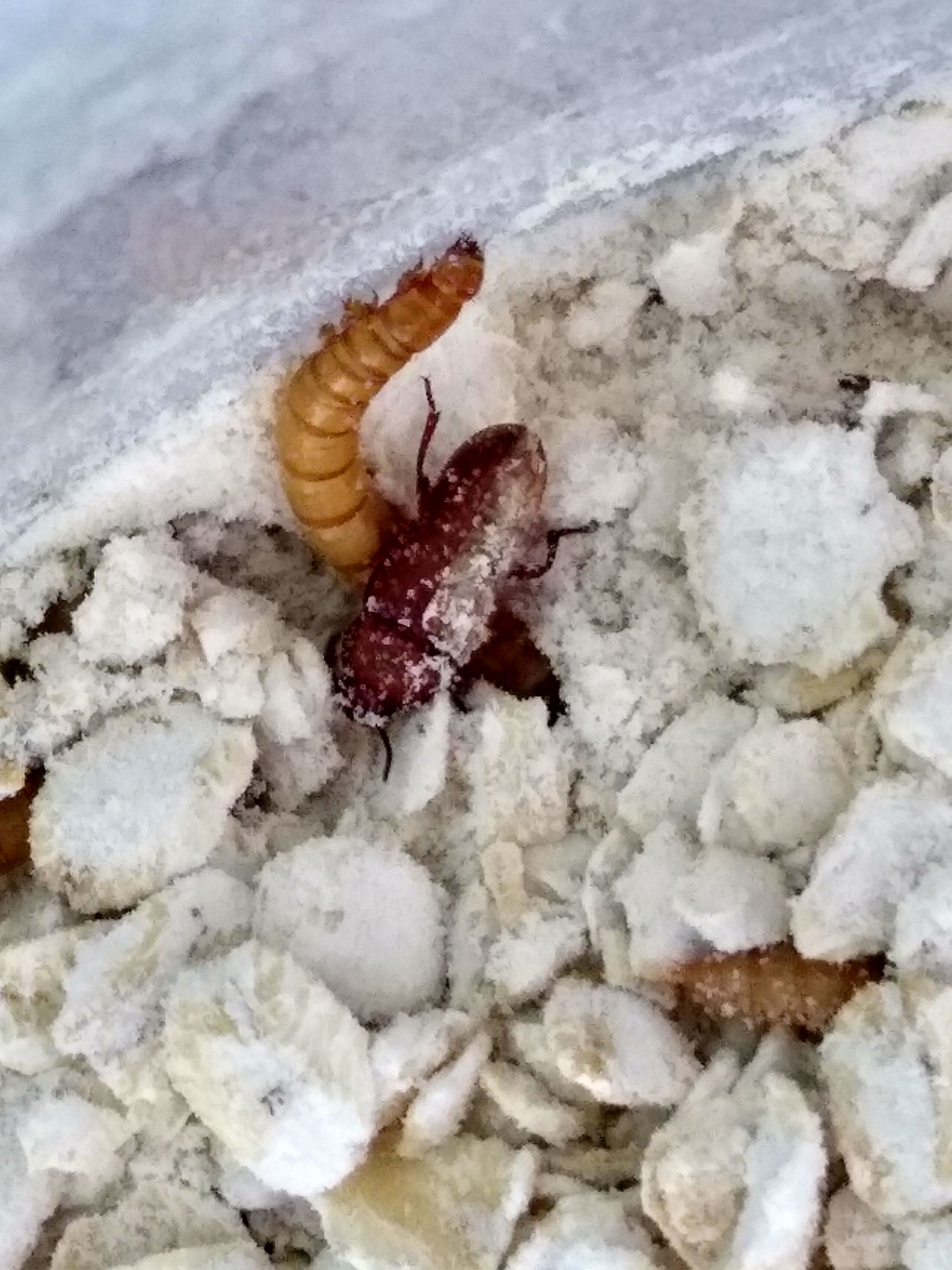 Da sich die Mehlwürmer und Puppen verkriechen, scheuchte ich dadurch viele Tiere auf. Dabei fand ich auch die ersten Käfer!