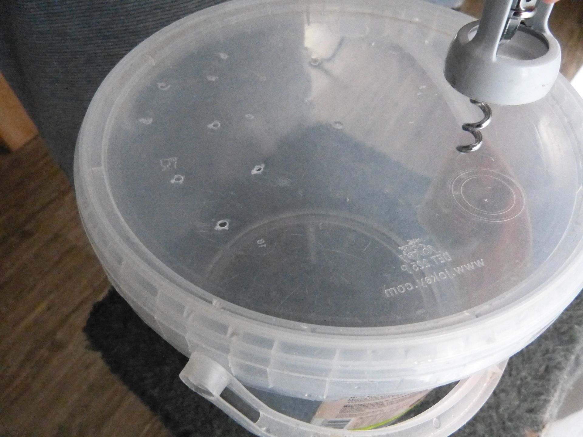 Der gereinigte Kunsstoffeimer mit Deckel dient als Beobachtungsgefäss. In den Deckel habe ich Löcher gestochen, damit die Mehlwürmer nicht ersticken.